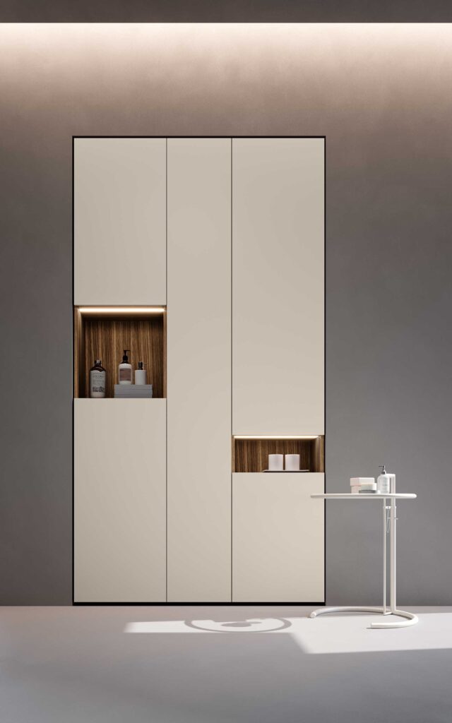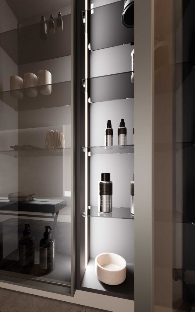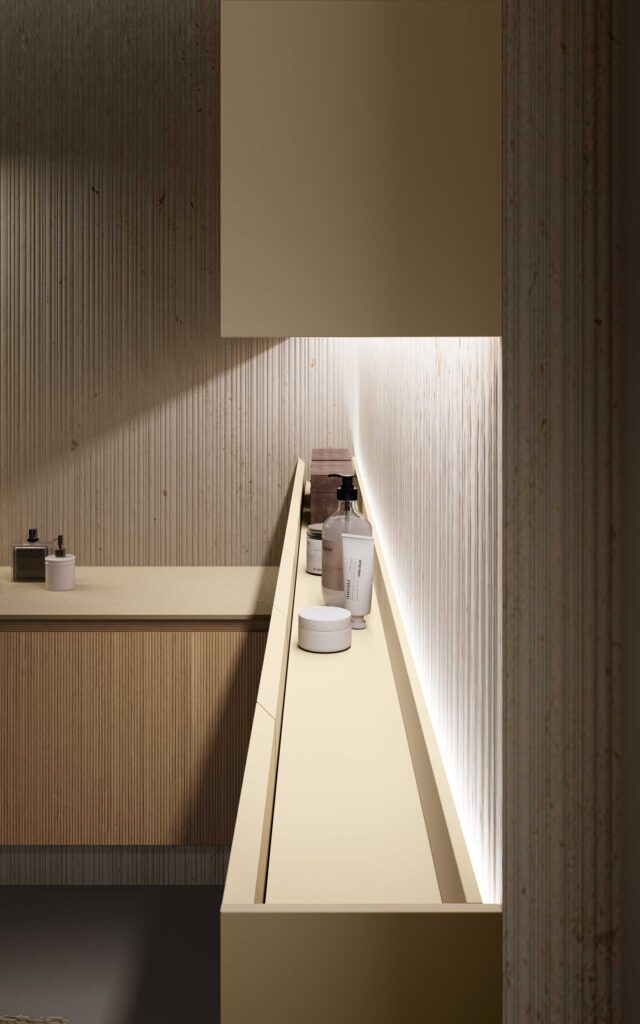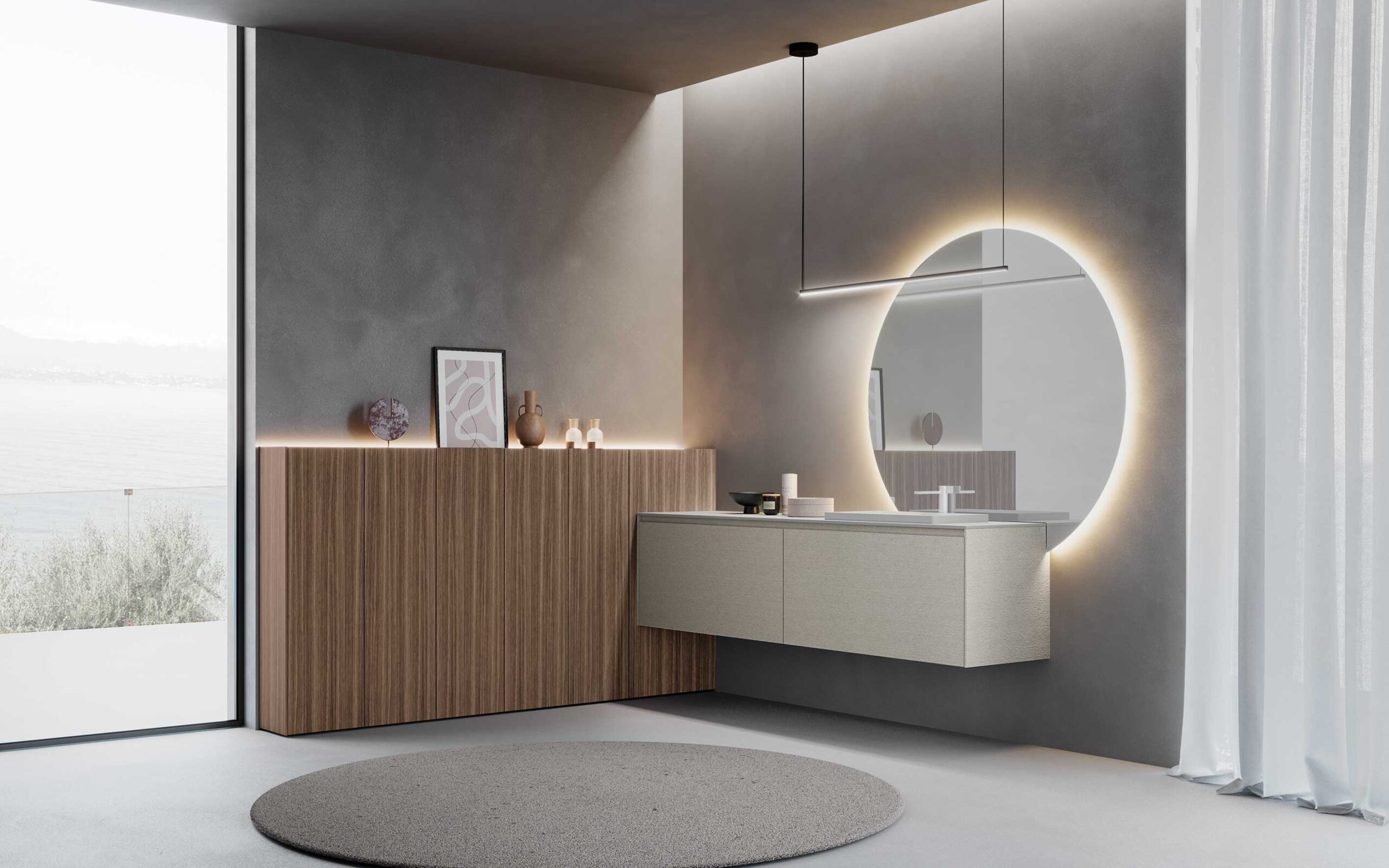 Un altro modo intelligente per inserire il LED nell’arredo bagno moderno è utilizzare la luce nei volumi verticali. Le colonne e i pensili, infatti, possono diventare non solo spazi di contenimento, ma veri elementi scenografici.