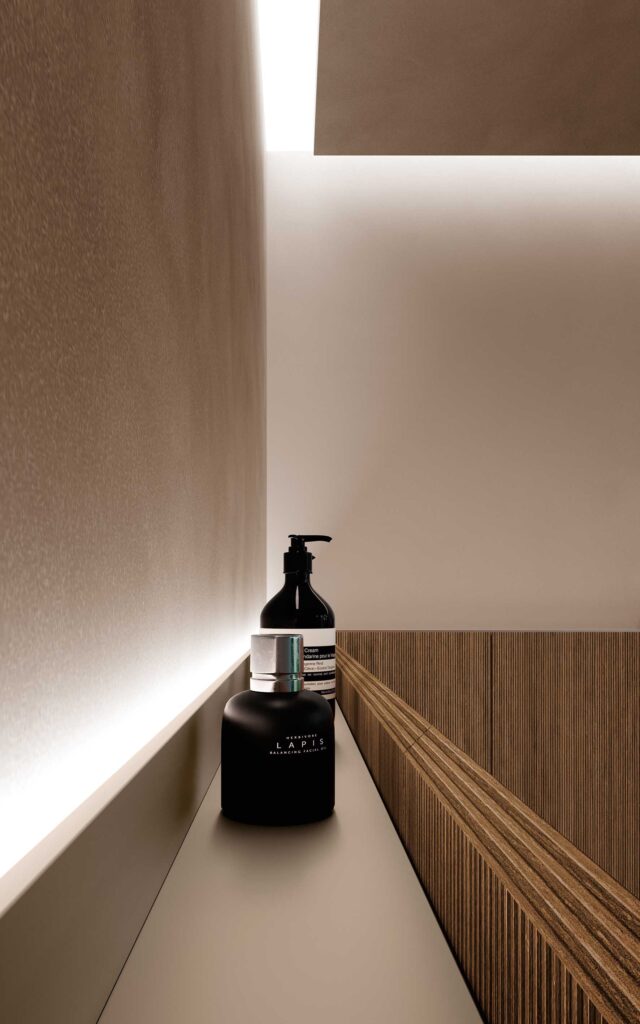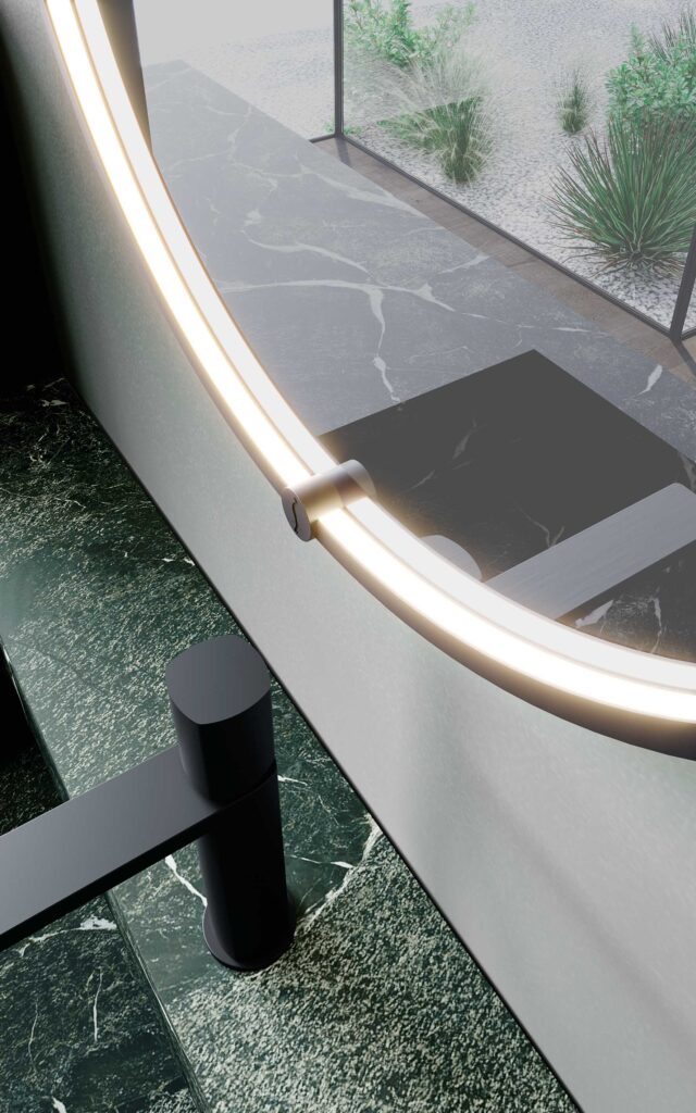 Anche la lampada THIN, presente in diverse lunghezze, lavora in questo senso: può essere utilizzata per sottolineare mensole, specchi o intere pareti attrezzate, contribuendo a dare continuità visiva alla composizione.