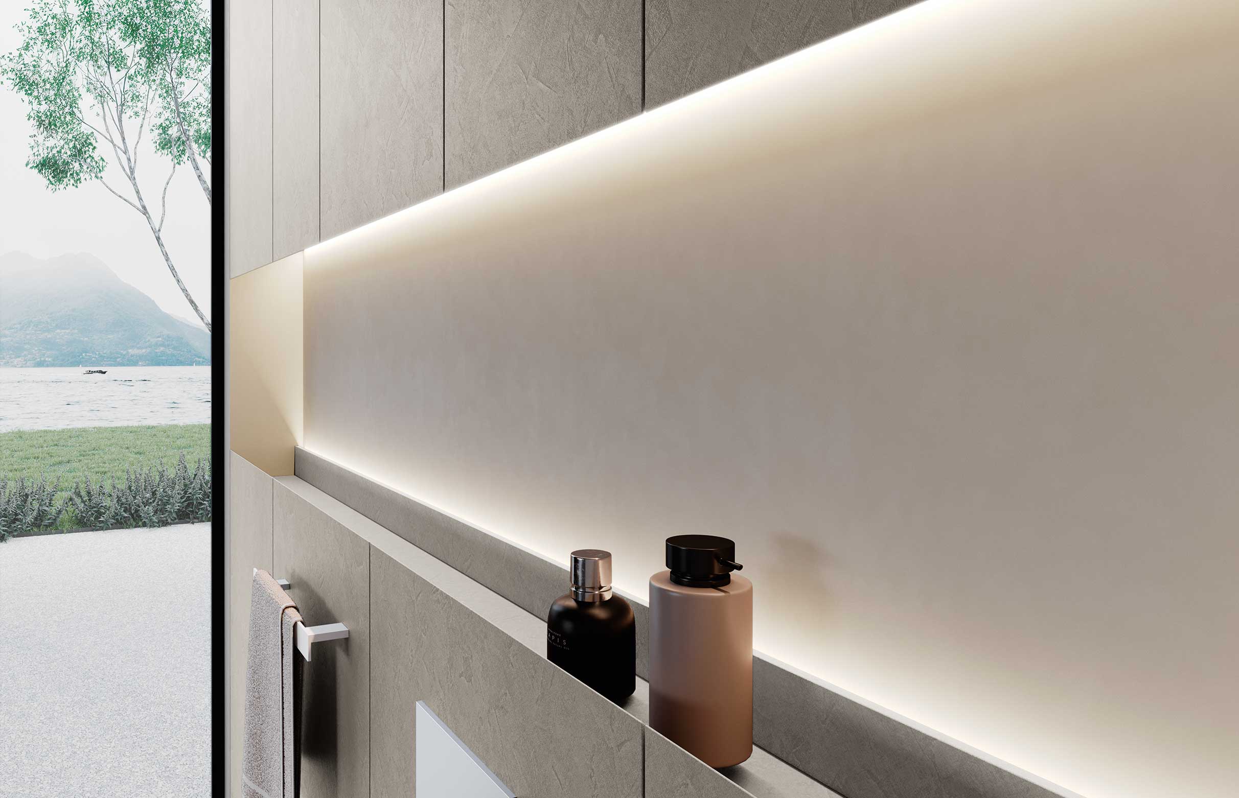 Al mattino, il bagno richiede una luce chiara e ben distribuita, utile per il trucco, la rasatura e la cura personale. La sera, invece, si può desiderare una luminosità più morbida, capace di trasformare il bagno in uno spazio più raccolto. Per questo è interessante integrare luci LED in punti diversi del progetto: intorno allo specchio, sotto i pensili, lungo una boiserie o all’interno di contenitori e colonne.