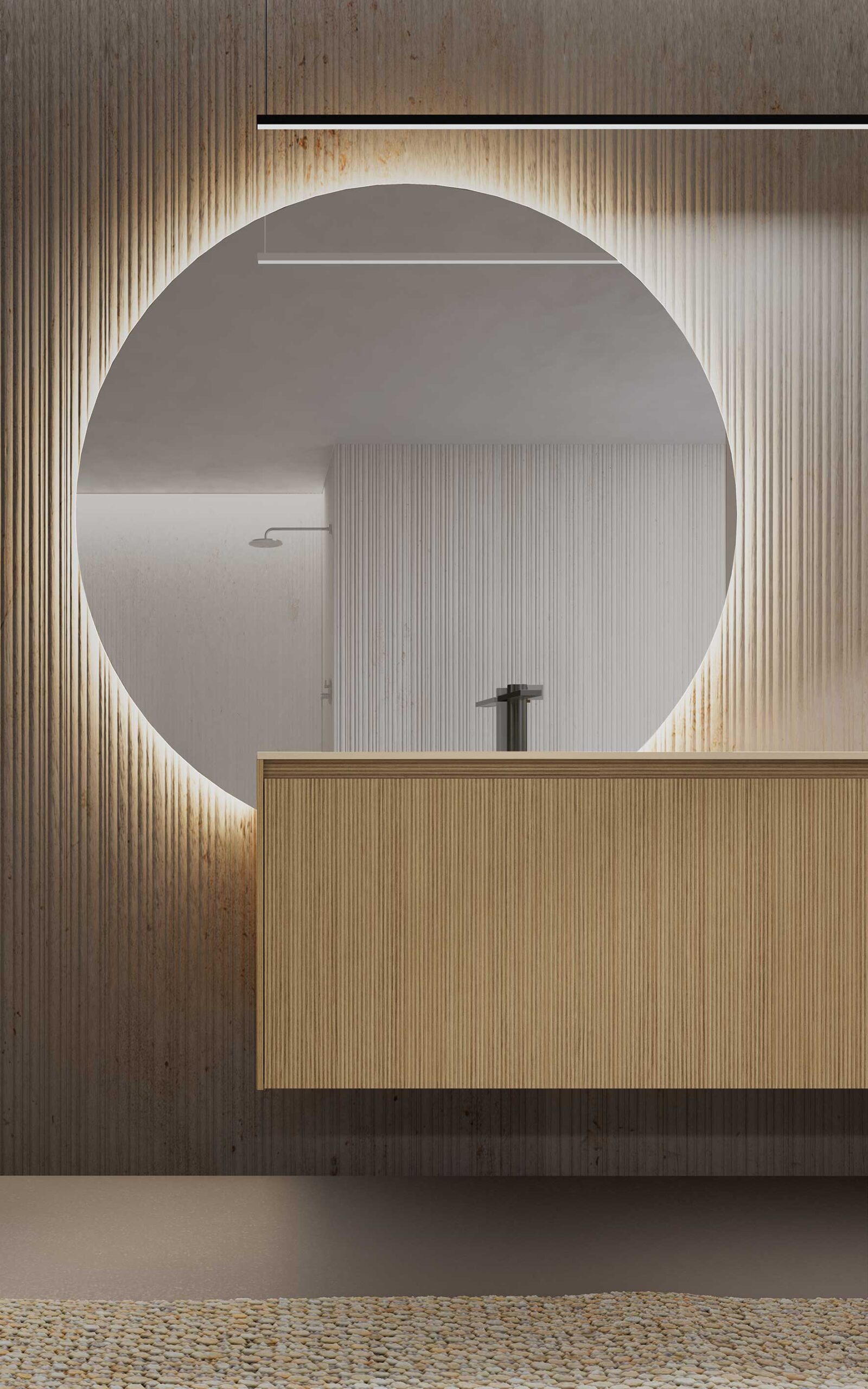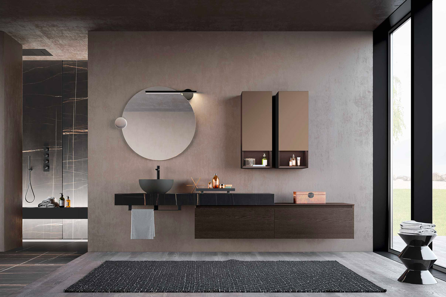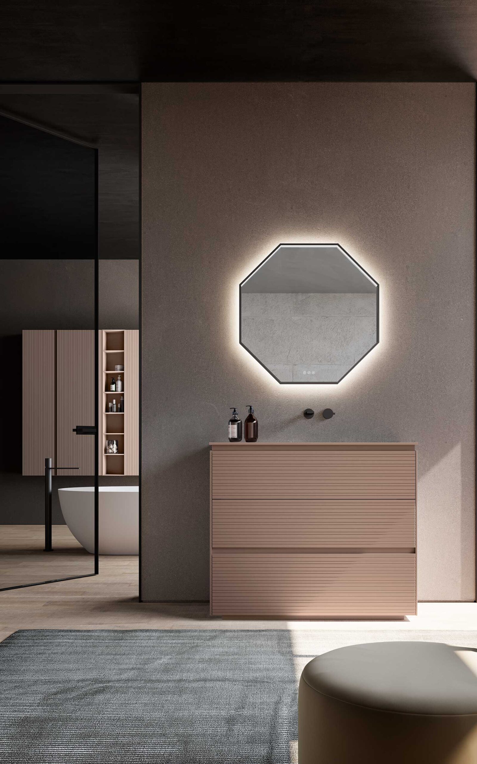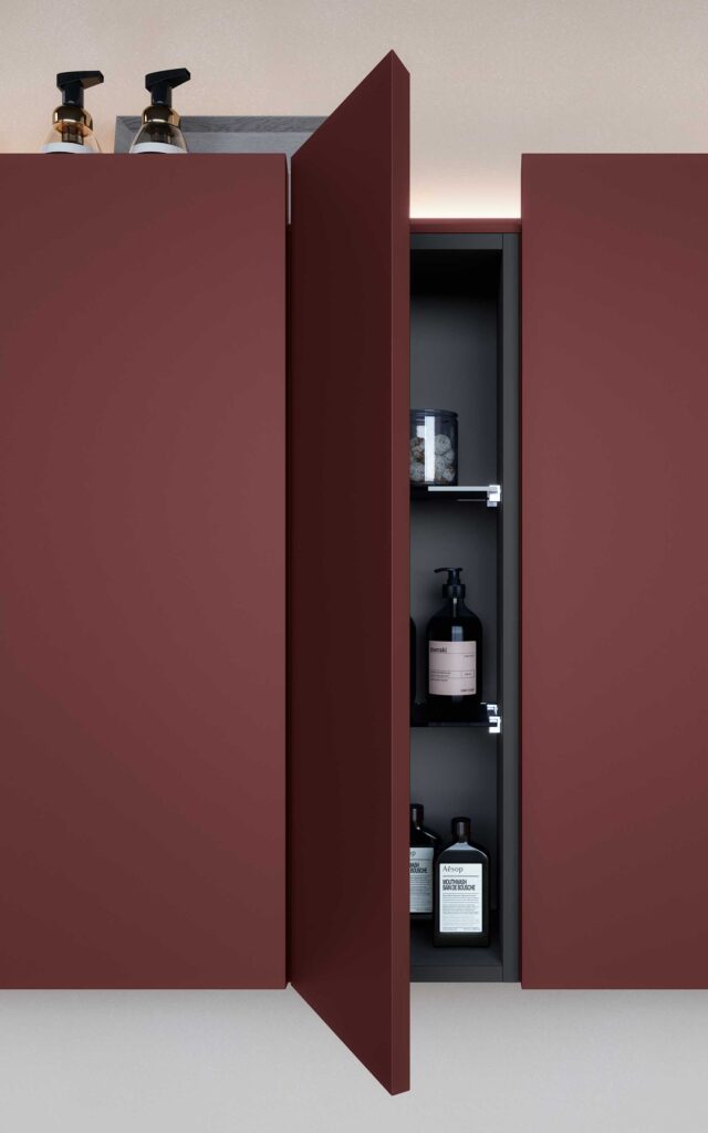 When mirrors and wall units are designed as an integral part of the bathroom environment, the result is a coherent and striking overall effect. The use of textures coordinated with the furniture below, the choice of tone-on-tone or contrasting colours, and the possibility of integrating lighting and accessories into the same compositional system transform the bathroom into a refined and contemporary space.