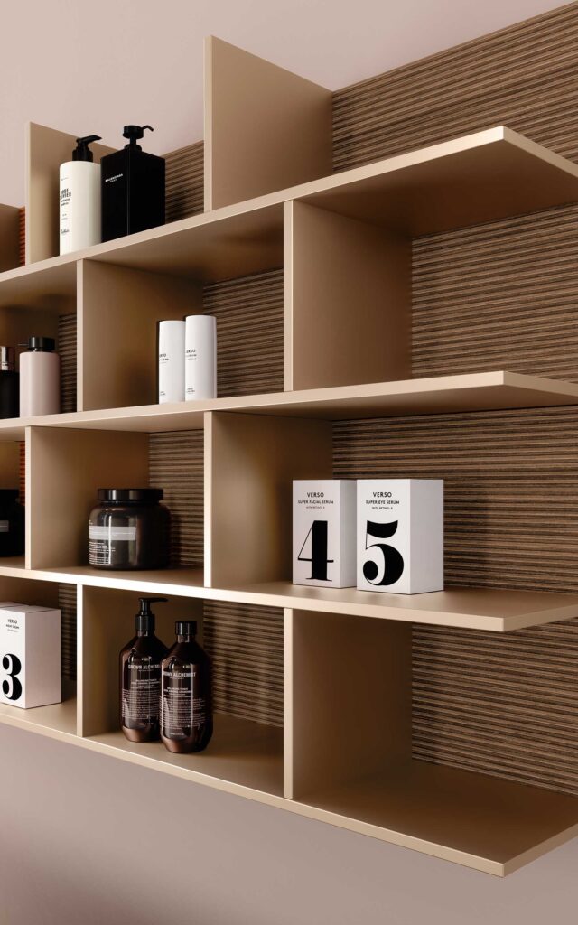 Examples include the CLEO wall units and the horizontal CLIMB configurations, which are ideal for creating ever-changing compositions on the wall thanks to their modularity. Details such as the integration of side LED strips and the possibility of alternating full and empty spaces demonstrate how the choice of these elements can completely change the appearance of the same wall.