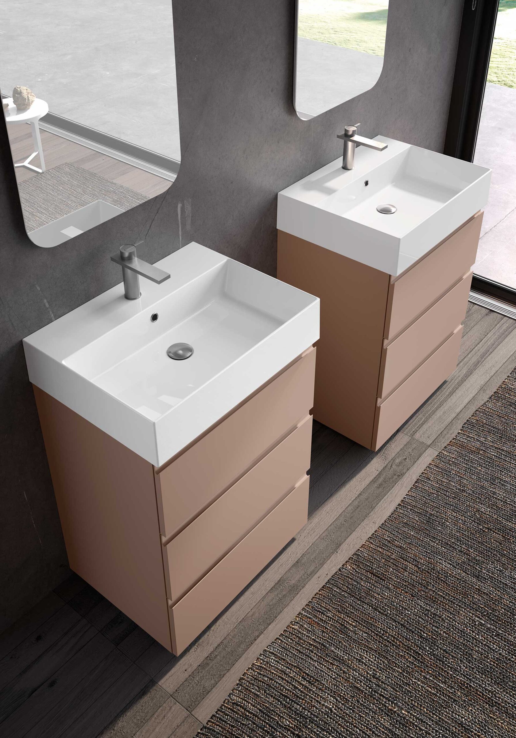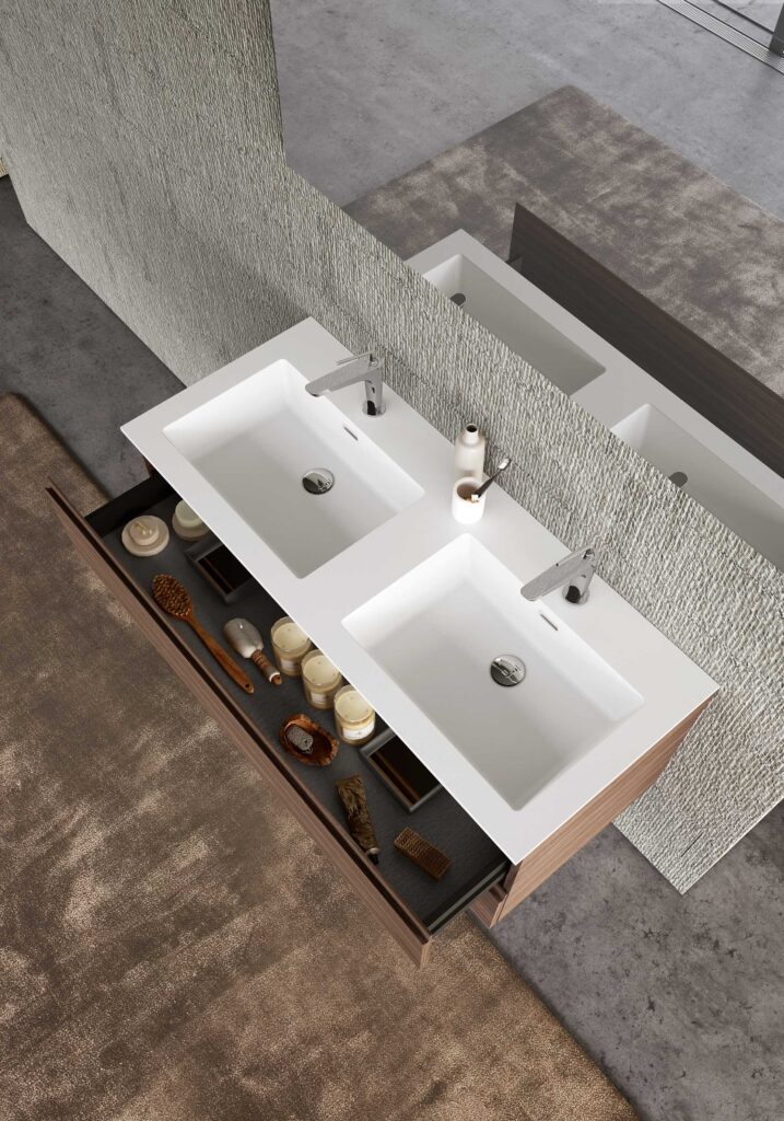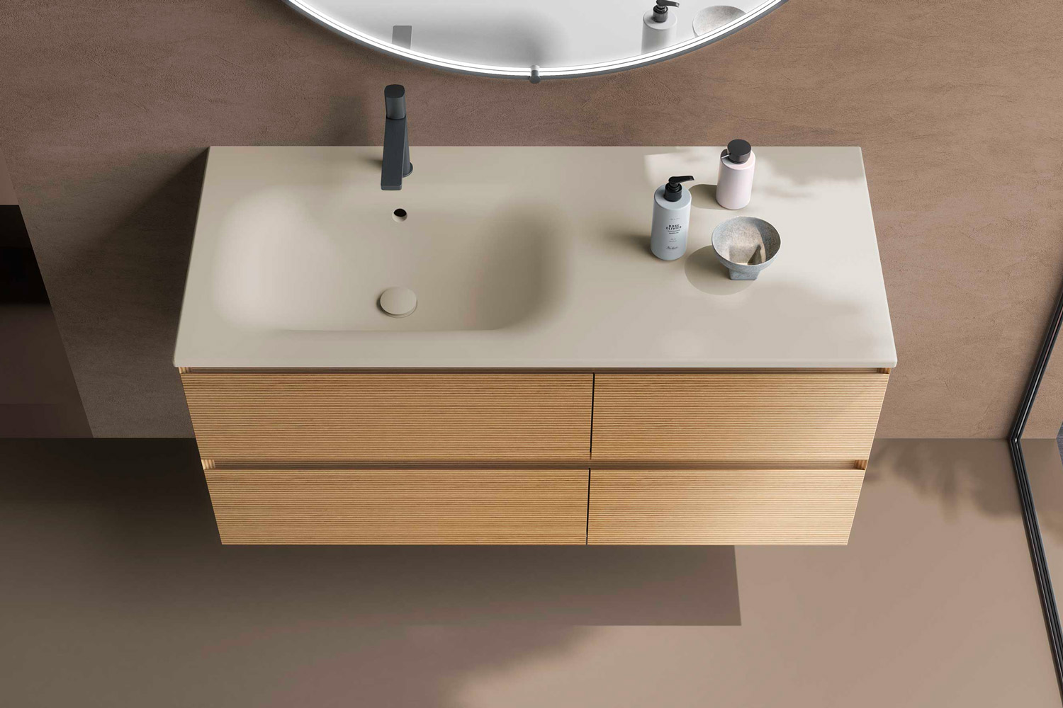 The three different depths of the bases (36.5 cm / 45.5 cm / 50 cm) allow for perfect integration even in small spaces, while the presence of central, off-centre or double washbasins further expands the design possibilities for the bathroom.