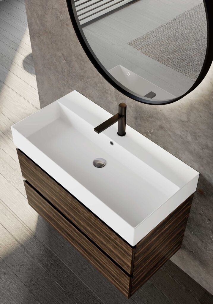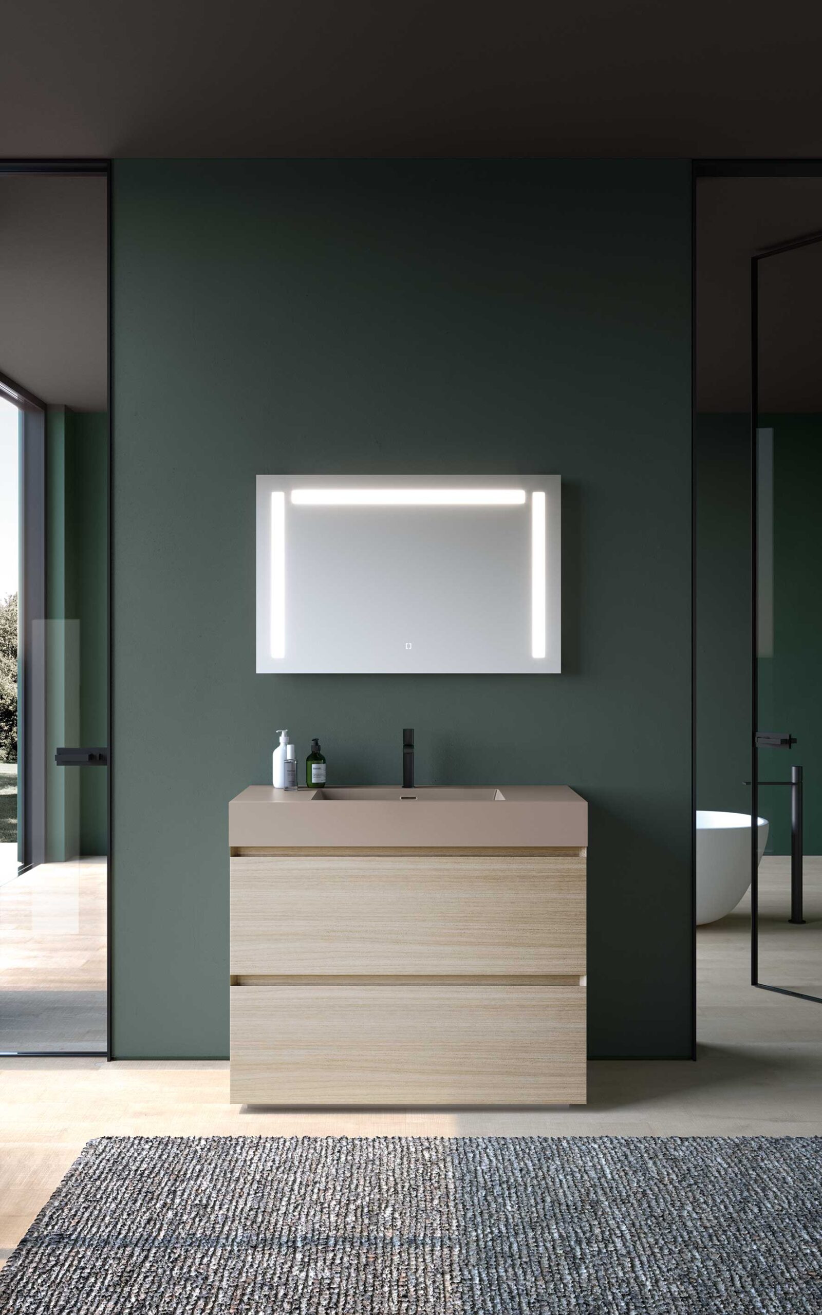 Monoblocks are the perfect solution for those looking for a compact, space-saving composition. The dialogue between the console and the base is harmonised by consistent material choices, often with colour references that echo the fronts, sides, mirrors, wall units, lamps and other accessories that complete the collection. The final effect is bathroom furniture that stands out for its stylistic consistency, functionality and everyday comfort.