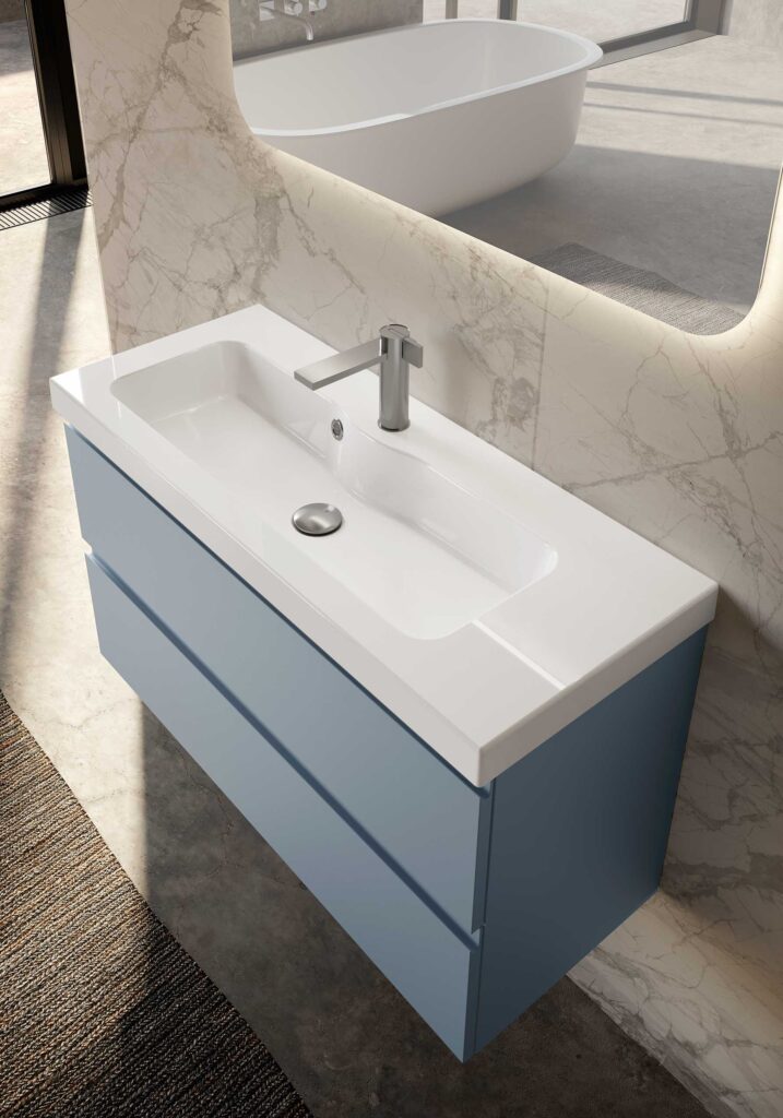 The Block 2024 catalogue offers a wide variety of materials and finishes, starting with bathroom cabinet tops with integrated bathtubs in white ceramic or glossy or matt Tekorlux, in white or coloured matt Plus+ton ceramic (scratch-resistant, stain-resistant, non-slip and anti-bacterial) or in matt Tekcolor.