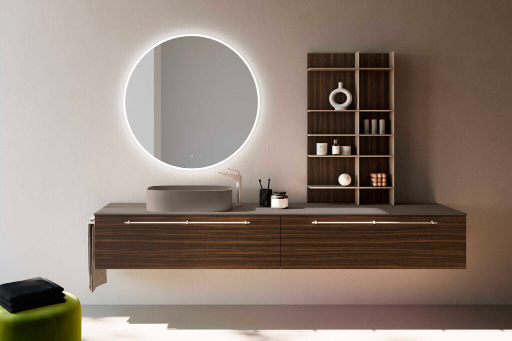 The Lime Ø collection not only offers a wide choice of handles as a distinctive feature, but also allows each composition to be further customised with exclusive details that enhance its elegance and character. Among the most refined options are the Cannettato and Cambio Senso Vena finishes, two solutions that add aesthetic depth and texture to bathroom furniture.