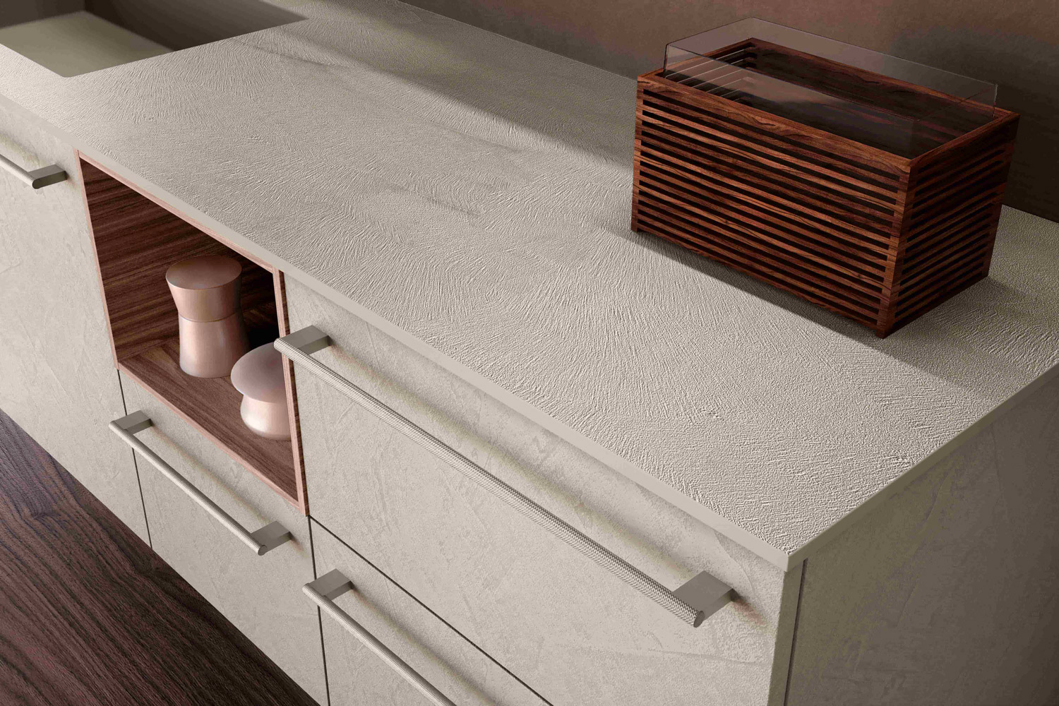 The Cannettato with its three-dimensionality transforms the fronts of the furniture into surfaces with a strong visual impact, playing with the rhythm of vertical or horizontal lines. The Cannettato Simmetrico or Asimmetrico creates a sophisticated effect of movement, enhancing the texture of the finishes and giving a unique identity to the composition.