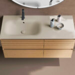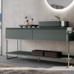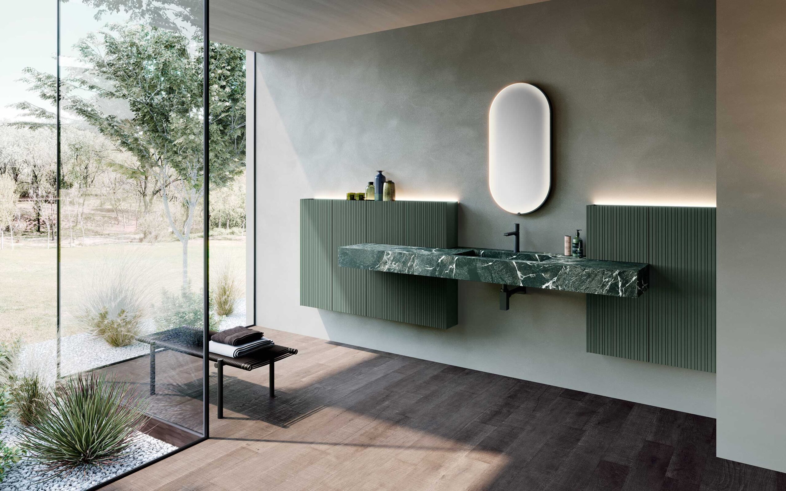 The Lime 2.0 collection, for example, offers a selection of materials that are ideal for those seeking balance and naturalness. Available in Dekorativo 3D Rigatino Naturale, Greso and soft-touch lacquers in shades such as Verde Salvia, Tortora, Blu Avio and Rosa Retrò opaco, these finishes are perfect for a bathroom inspired by slow living. The choice of combinations of wall units, mirrors and open compartments makes the whole look light and welcoming.